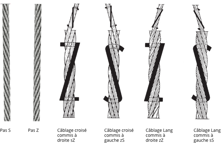 Le pas est le sens de rotation des fils autour de l’âme centrale (textile ou métallique). Si les fils (ou torons) extérieurs sont commis vers la gauche autour de l’âme, on qualifie le câble de commis (ou pas) à gauche « S ». Si les fils (ou torons) sont commis vers la droite, on qualifie en revanche le câble de commis (ou pas) à droite « Z ». Pour les câbles, on distingue également le câblage croisé du câblage Lang. En l’absence de spécification, le sens de la torsion portera couramment sur un câblage croisé commis à droite.